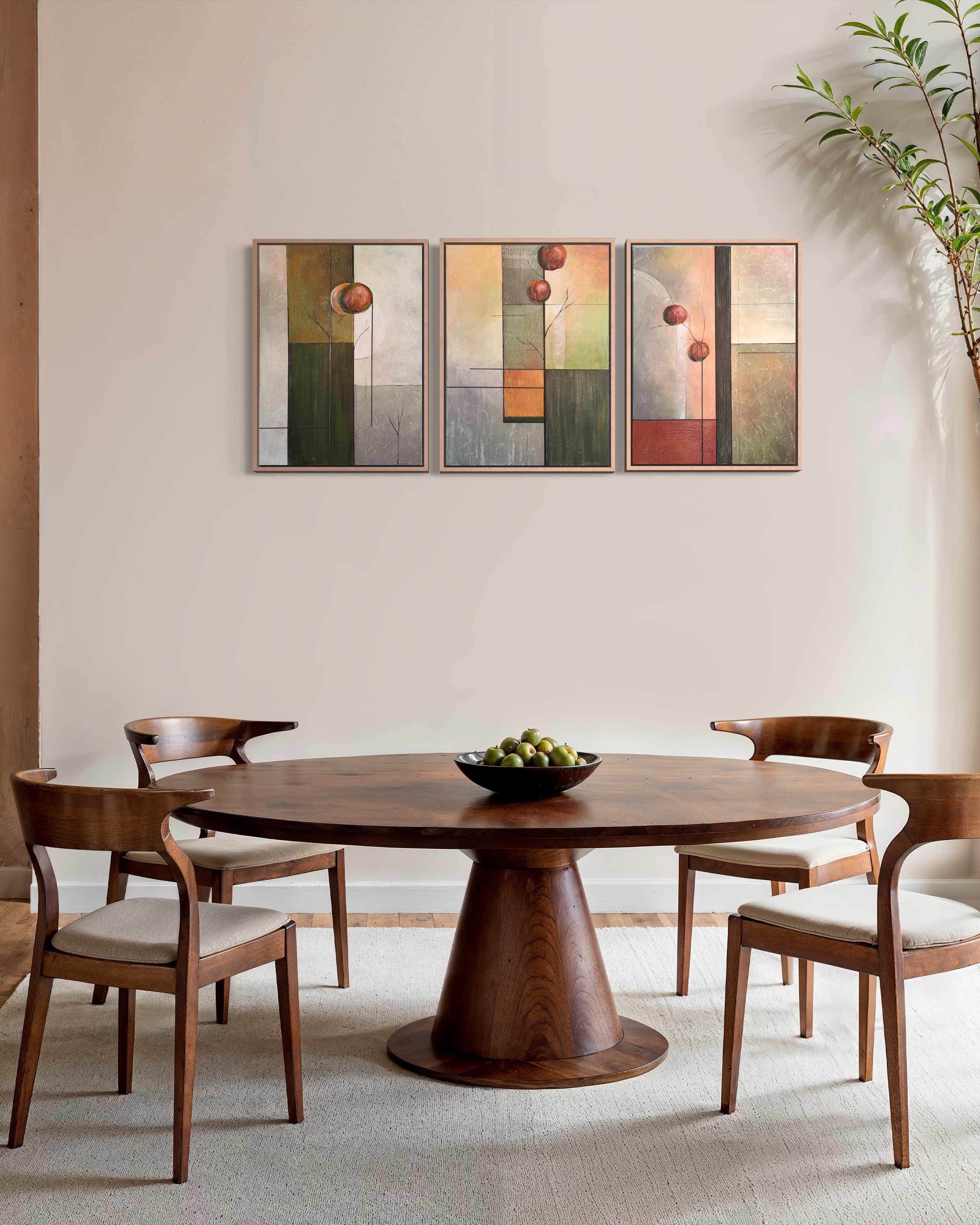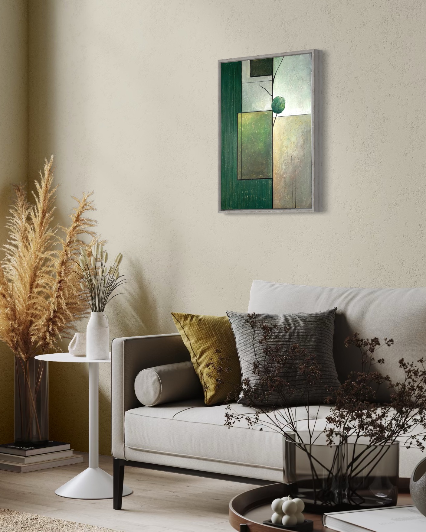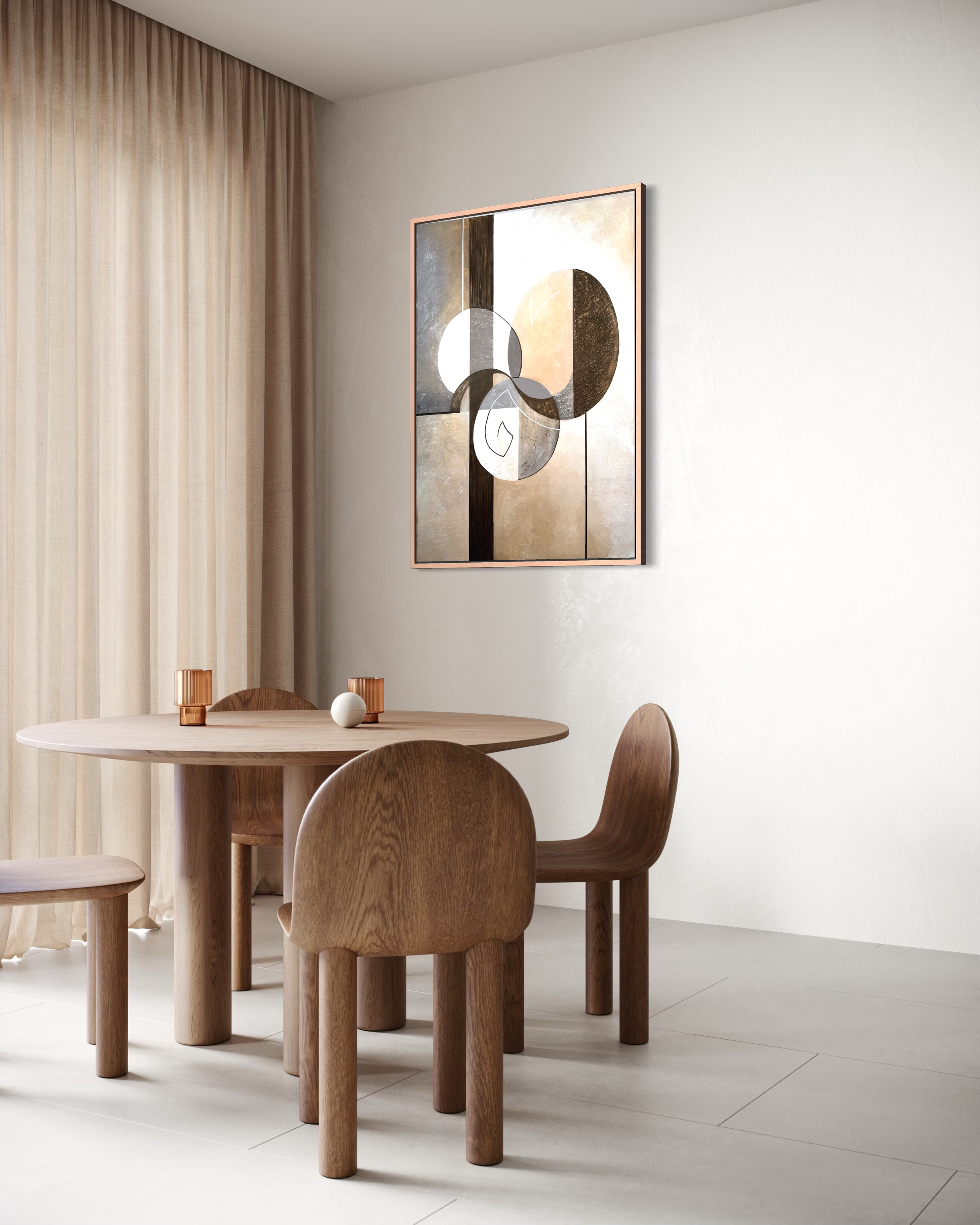 Every piece begins with an idea inspired by nature, architecture, and emotional balance. I work with visual references and mood boards to ensure the artwork aligns naturally with its future space while staying true to my artistic language.