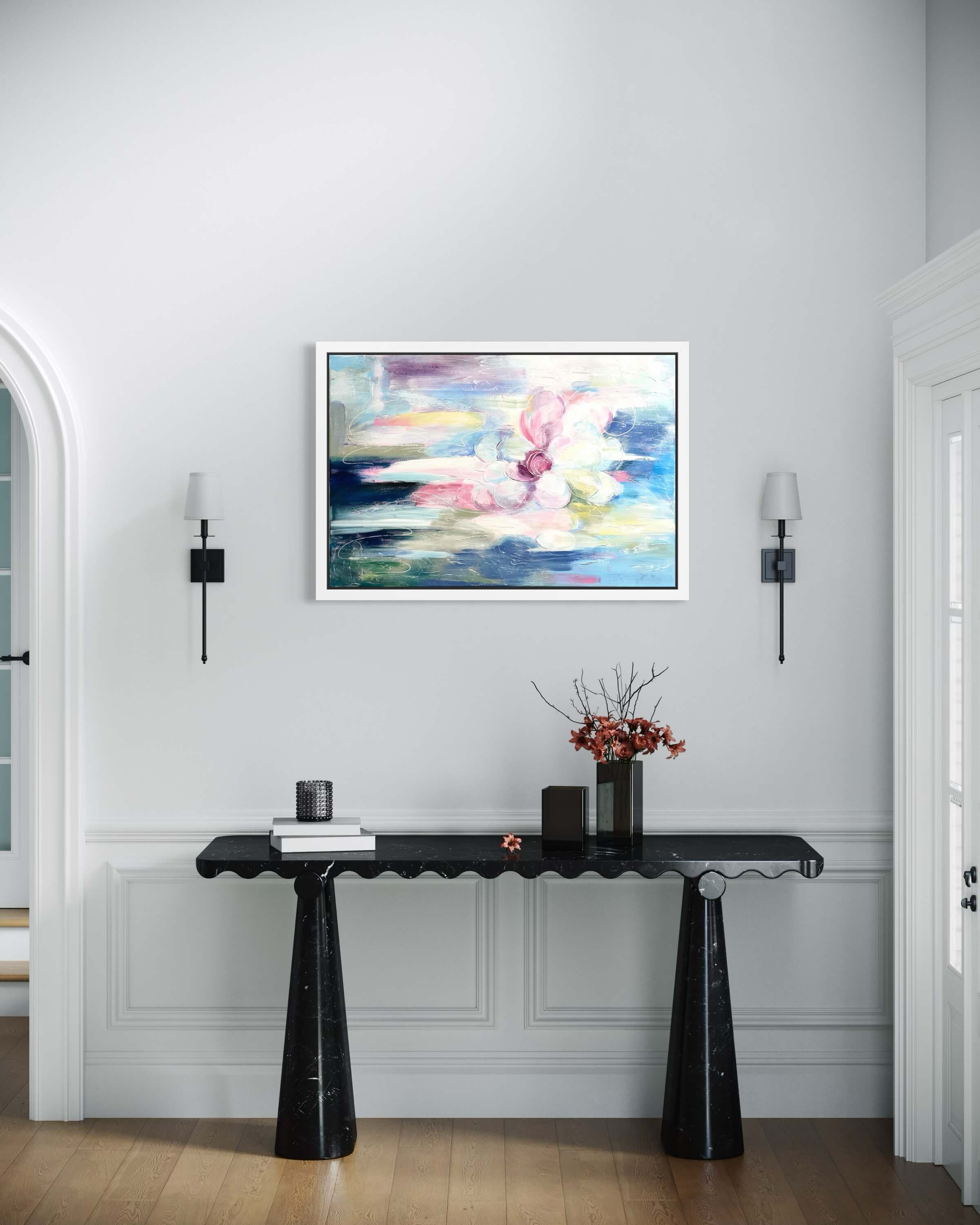 This painting is inspired by moments of soft light and dissolving forms — those instances when the surrounding world shifts from being a clear image to a pure feeling. The initial impulse came from the idea of a blooming shape or a cloud-like structure existing between nature and abstraction. I wanted to capture movement, transition, and lightness in a way that cannot be expressed literallyI hope the viewer feels a sense of calm and an inner pause, a quiet connection with a gentle, luminous atmosphere. This work is created so that each person can discover something personal within it: a blossom, a reflection, a sunrise, or simply a moment of stillness. It is open to interpretation and invites the viewer into a slow, meditative space.