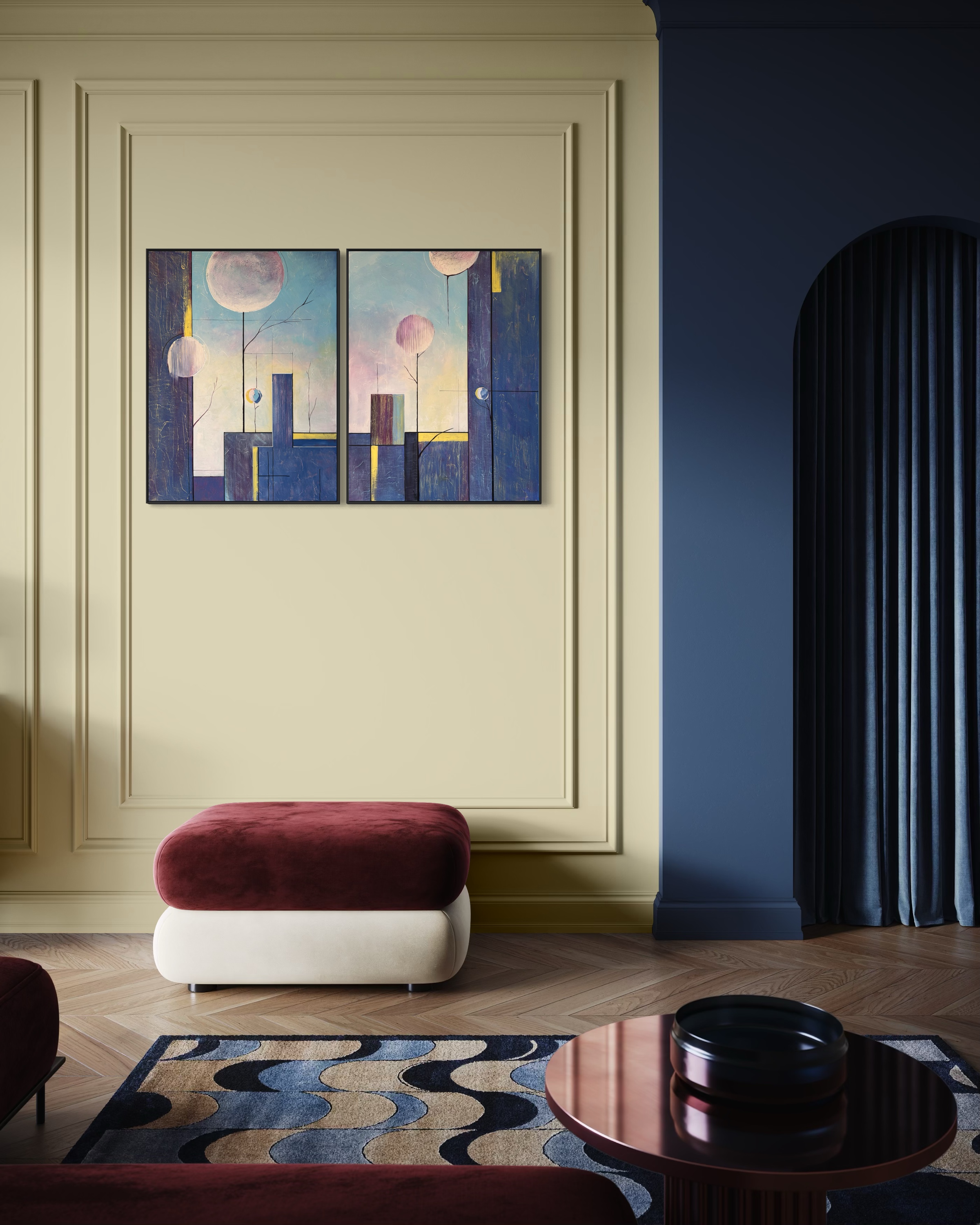 The clean geometry and atmospheric color transitions make this series ideal for modern, minimalist, or architectural spaces. It introduces a sense of clarity and quiet brightness without overwhelming the room.