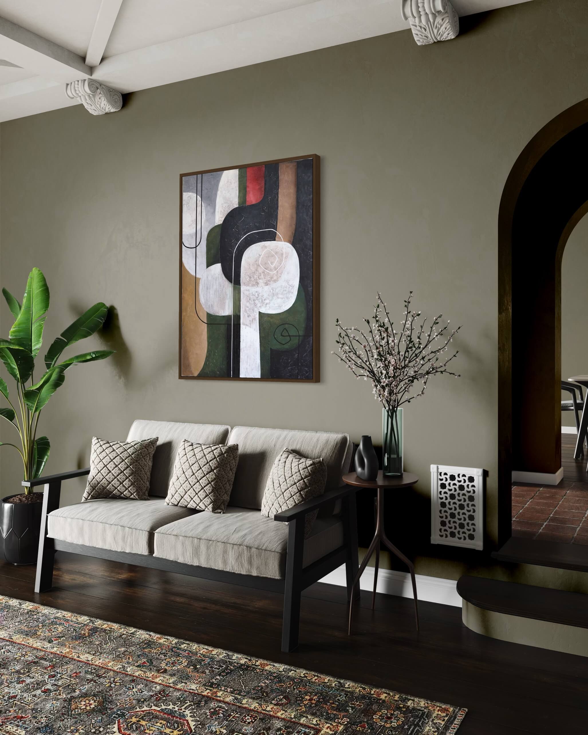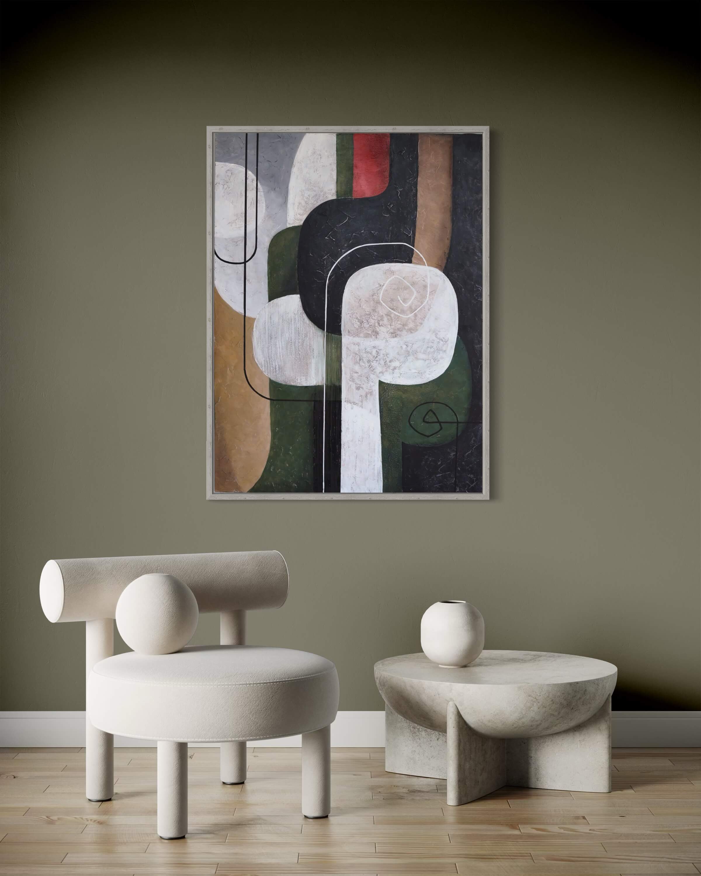 This large modern abstract painting fuses bold form with textural depth. Organic curves and intersecting lines in black, white, olive green, bronze, and a hint of red evoke a sense of movement and quiet tension. With sculptural texture and a high-contrast palette, the piece draws the eye and energizes the space.