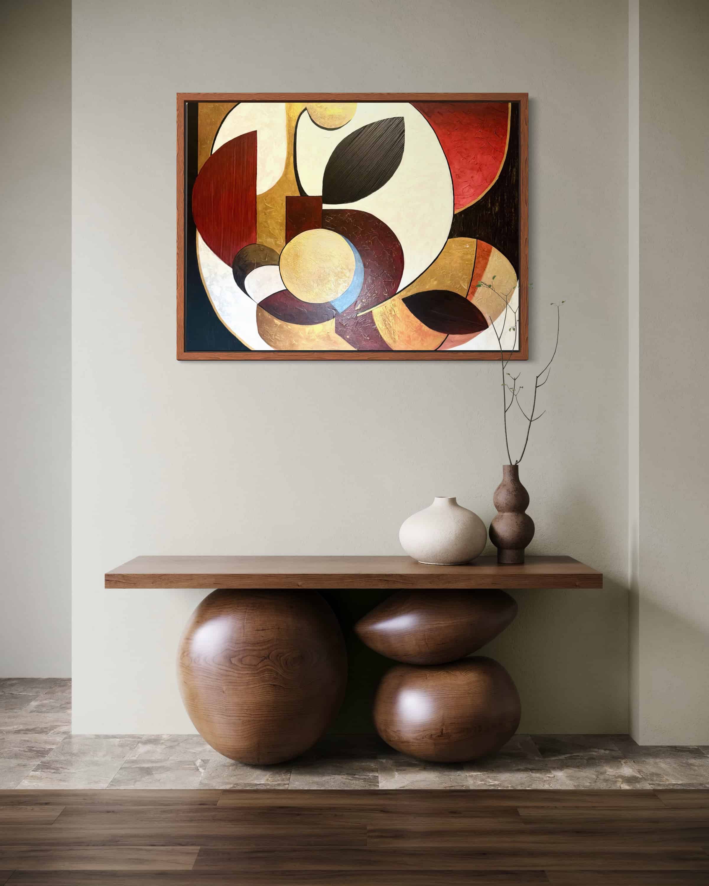 “Golden Harmony” is a textured mixed-media abstract inspired by the warm geometry of early autumn. Curved, leaf-like forms and layered golden tones echo the natural rhythm of the season, while deep reds and earthy neutrals bring richness and quiet strength to the composition.