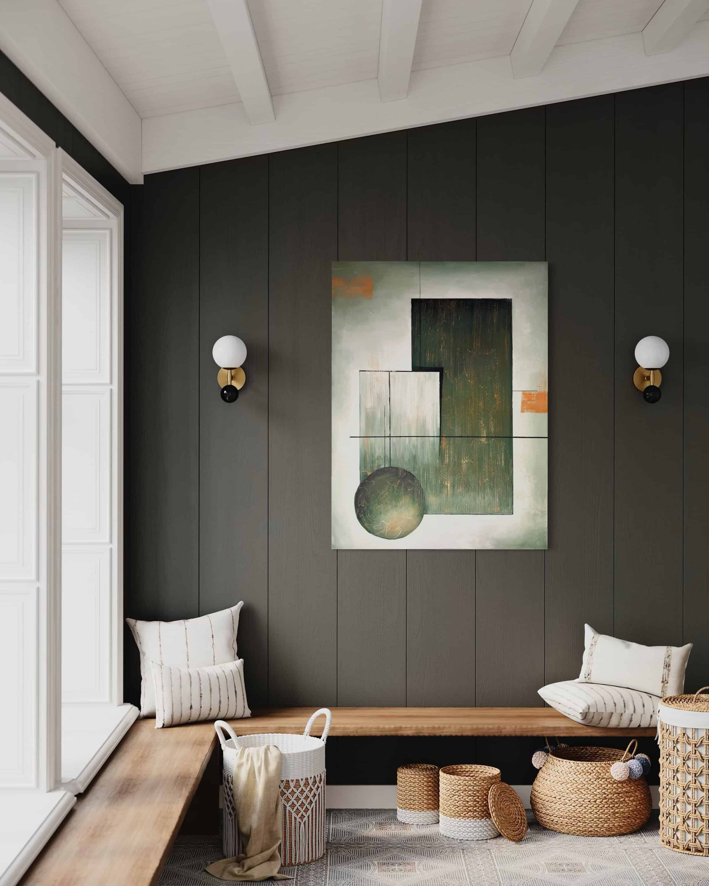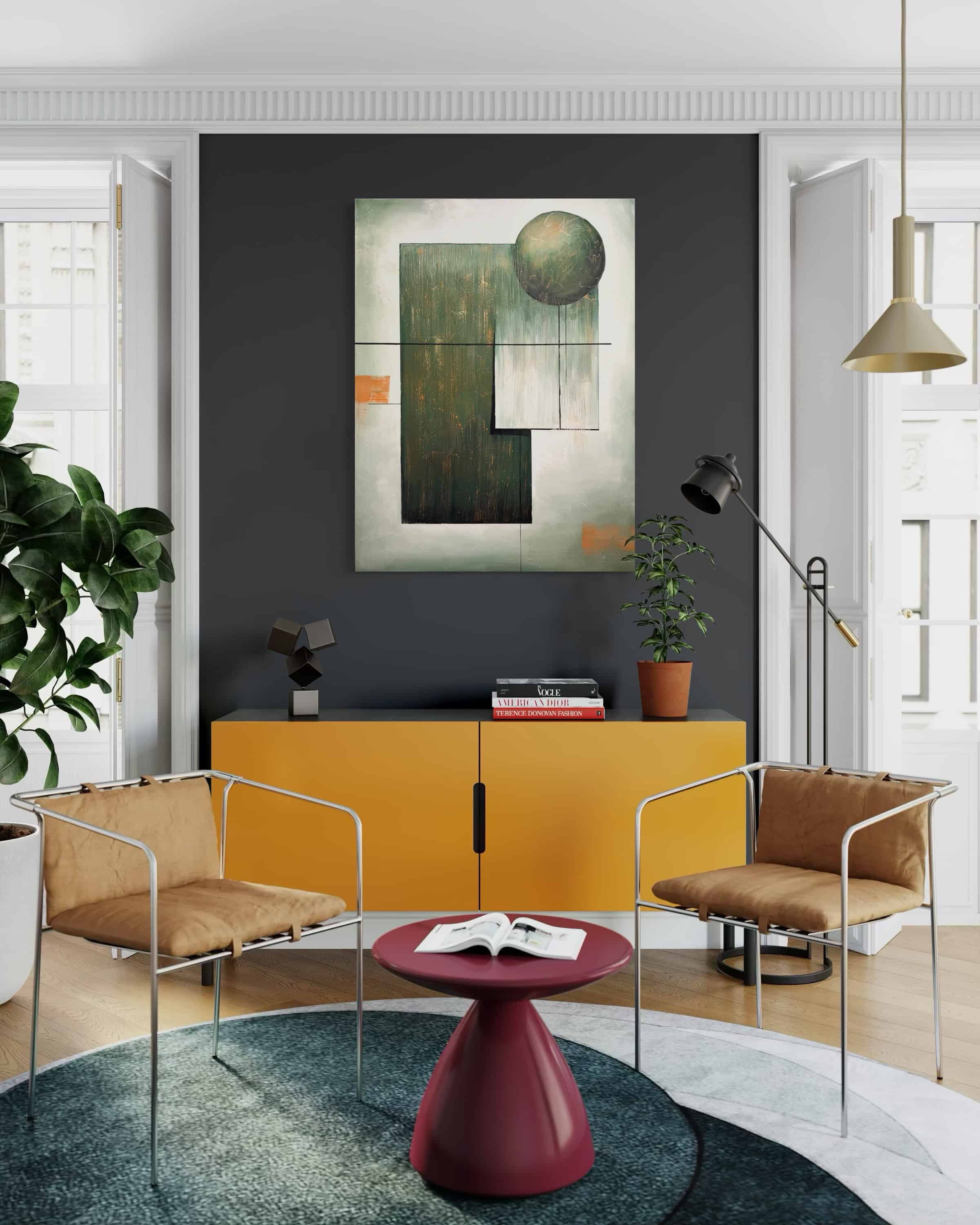 This work is inspired by the dialogue between architecture and abstraction — the way geometric forms can create a sense of order, depth, and quiet tension. I was particularly drawn to the contrast between the rigid rectangular structures and the soft, rounded presence of the sphere, as if it is entering or disrupting the composition with intention. The palette of deep green, muted white, and warm accents echoes patinated metals, natural shadows, and modern architectural surfaces.My hope is that viewers feel a sense of balance and grounded calm when they encounter this piece. The composition invites contemplation: the clean lines, the weighted shapes, the interplay between solidity and openness. It is a structured space, yet one that leaves room for interpretation and emotional response.