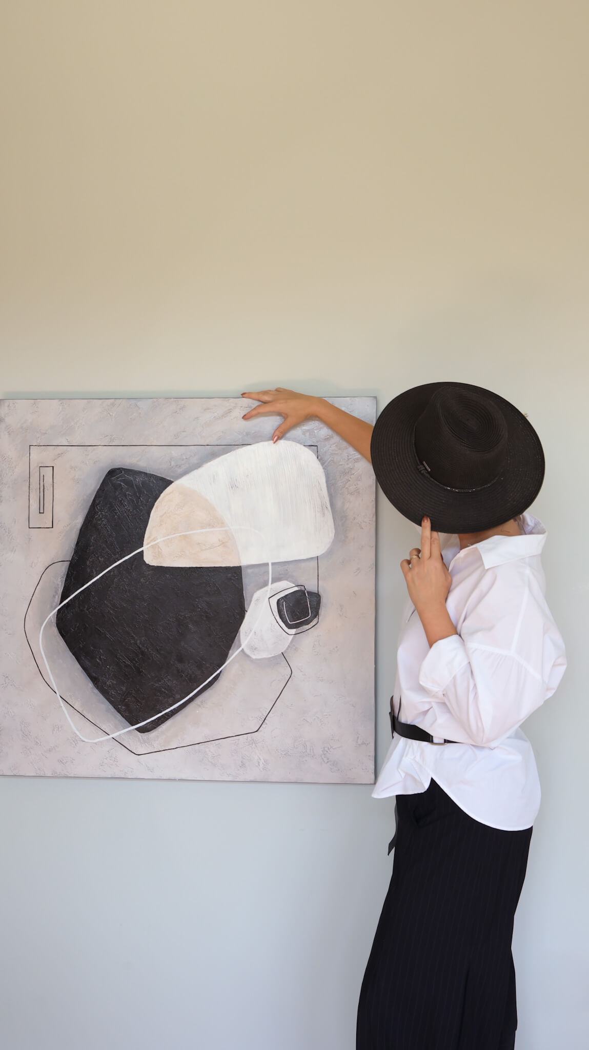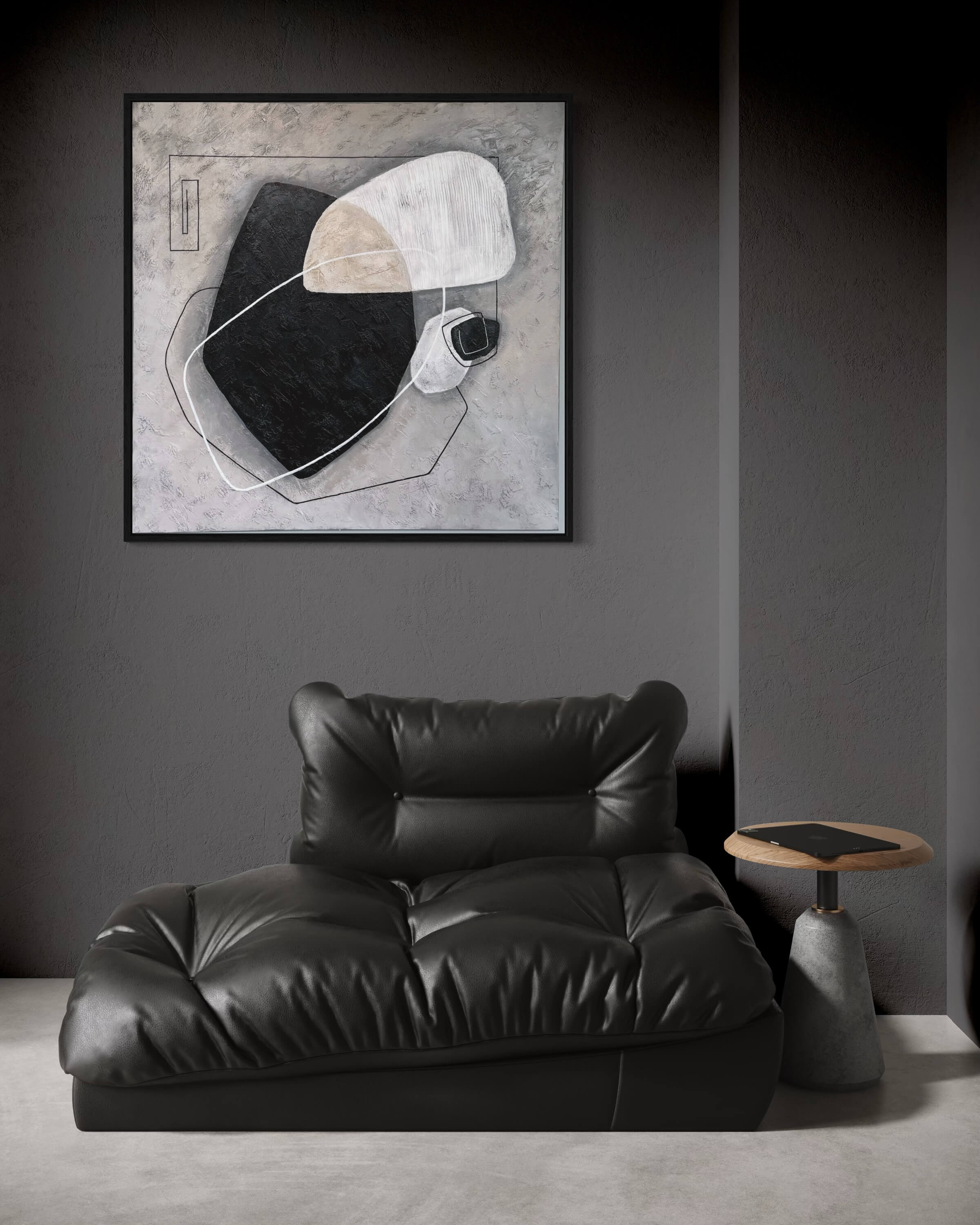 It uses muted tones—black, gray, white, and beige—with subtle gradients.