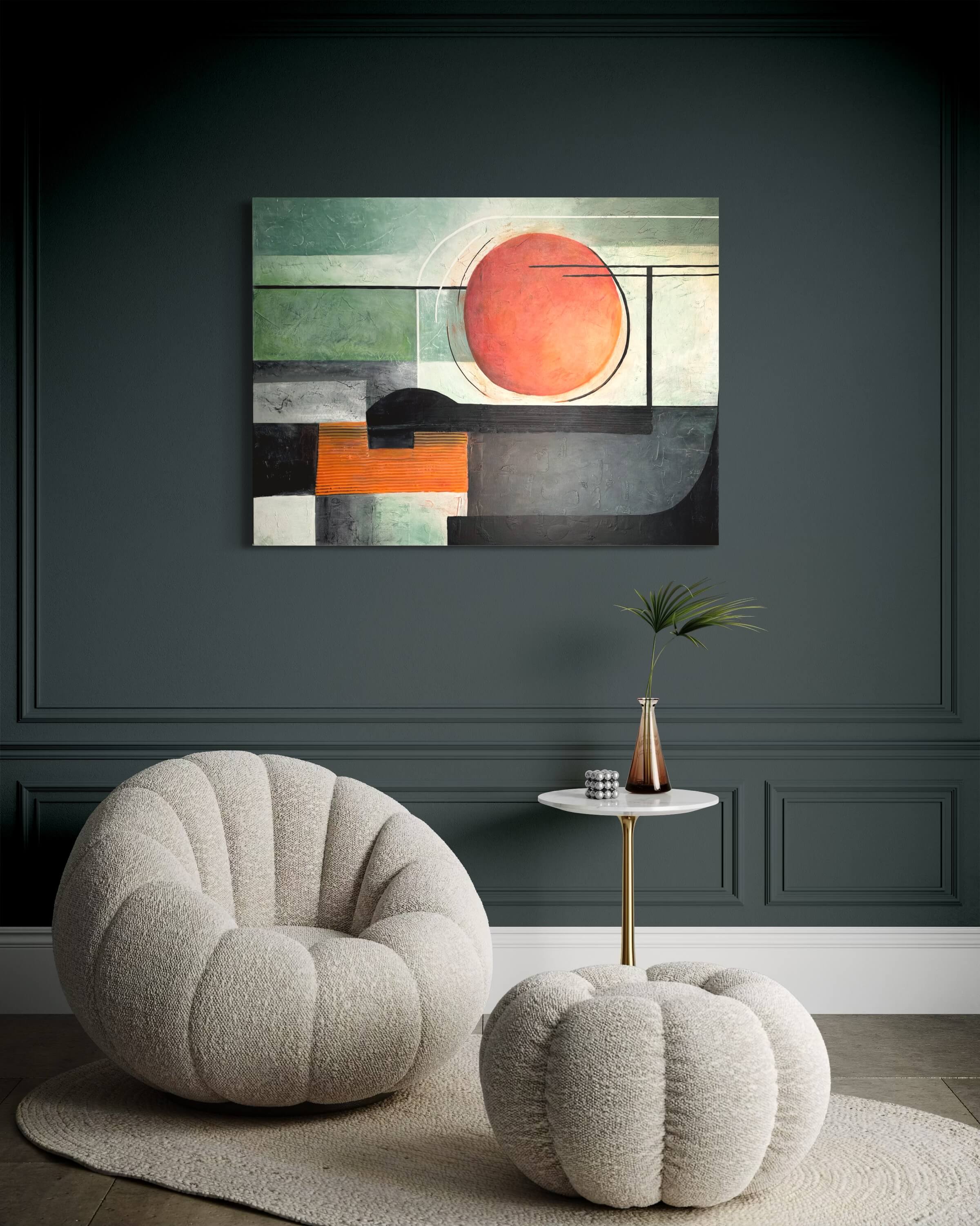 This piece explores the delicate balance between harmony and opposition. The bold, radiant sphere emerges as a symbol of energy and vitality, while the geometric lines and layered textures bring structure and grounding. The interplay of warm orange and deep cool tones creates a rhythmic dialogue—a contrast that both challenges and unites.