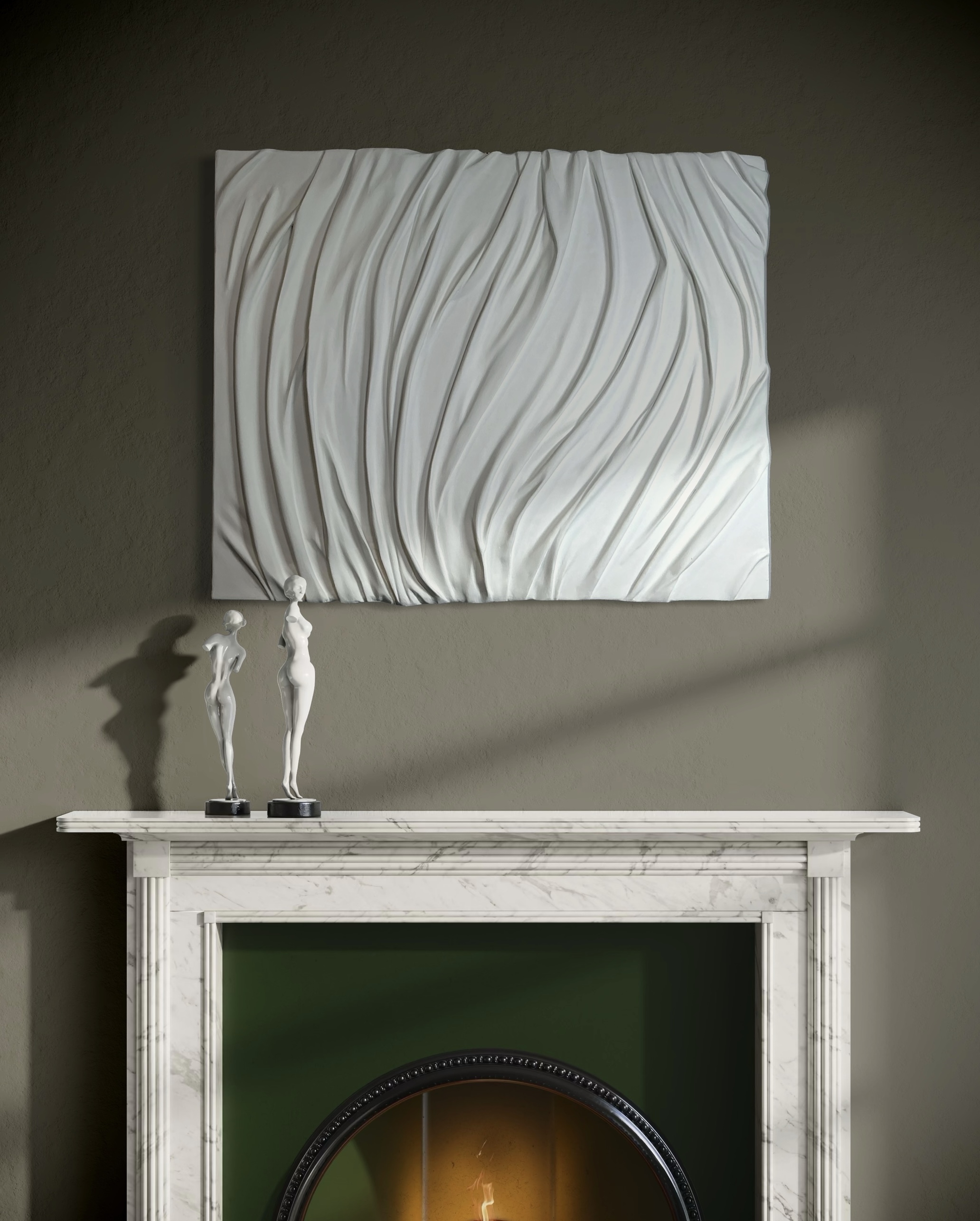 The work mimics draped fabric or flowing folds, evoking softness and motion despite being a rigid material. Similar to contemporary textile art, but executed in a sculptural medium. Abstract Organic Forms: The flowing lines resemble natural rhythms—waves, wind, sand dunes, or skin—making it biomorphic in feel.